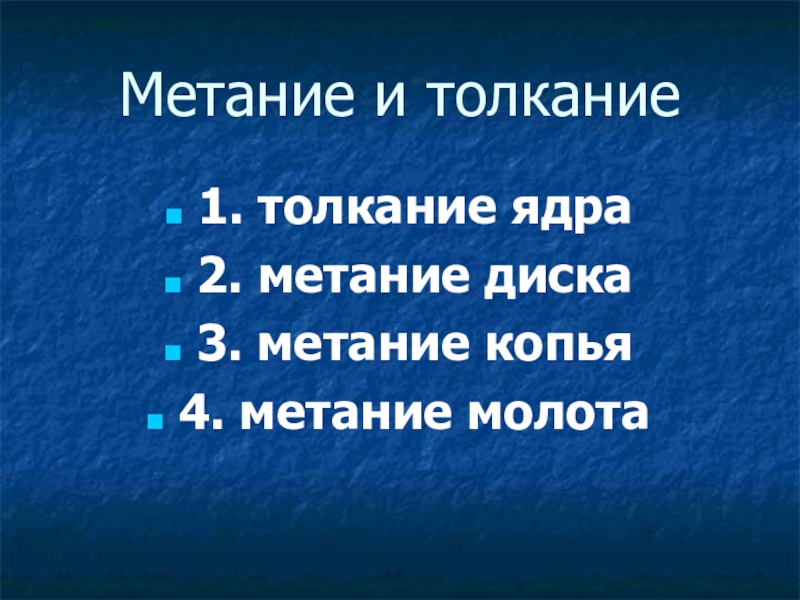 Метание и толкание 1. толкание ядра2. метание диска3. метание копья4. метание молота