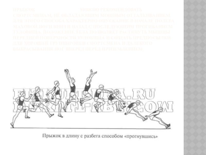Слайд 17Прыжок «прогнувшись» можно рекомендовать спортсменам, не обладающим мощным отталкиванием. Для этого
