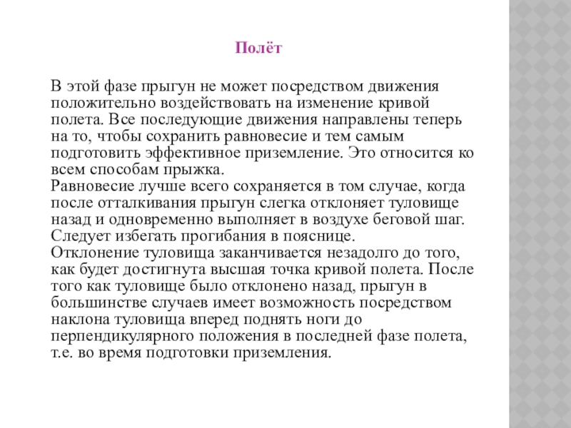 опускаются. Тем самым можно достигнуть теоретически наибольшей длины прыжка. Если во время полетной фазы туловище не отклонено назад, прыгун не в состоянии достаточно высоко поднять ноги и при приземлении дальность прыжка уменьшается. Все движения, выполняемые прыгуном во время фазы полета, преследуют цель обеспечить возможно более дальний полет.