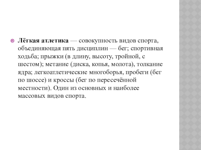 Слайд 2Лёгкая атлетика — совокупность видов спорта, объединяющая пять дисциплин — бег; спортивная ходьба; прыжки (в длину, высоту, тройной, с
