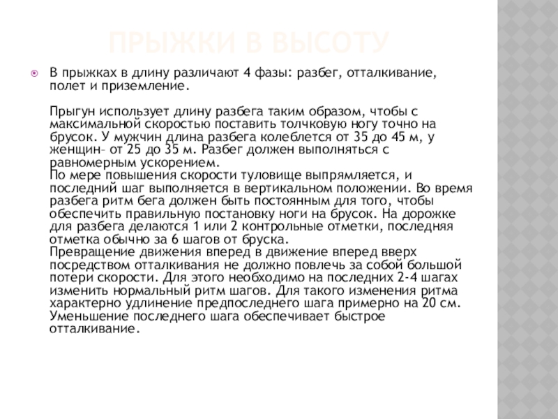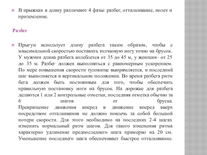 Слайд 12В прыжках в длину различают 4 фазы: разбег, отталкивание, полет и