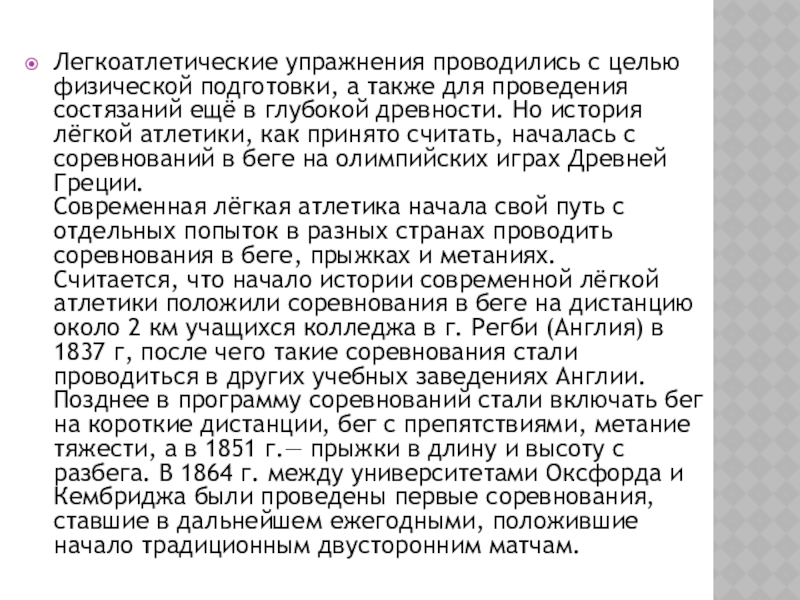 Считается, что начало истории современной лёгкой атлетики положили соревнования в беге на дистанцию около 2 км учащихся колледжа в г. Регби (Англия) в 1837 г, после чего такие соревнования стали проводиться в других учебных заведениях Англии.