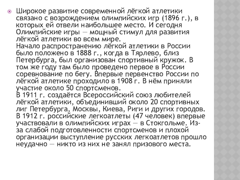 Слайд 4Широкое развитие современной лёгкой атлетики связано с возрождением олимпийских игр (1896