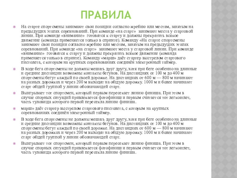 на предыдущих этапах соревнований. При команде «на старт» занимают места у стартовой линии. При команде «внимание» готовятся к старту и должны прекратить всякое движение (команда применяется только в спринте). Команду «На старте спортсмены занимают свои позиции согласно жребию или местам, занятым на предыдущих этапах соревнований. При команде «на старт» занимают места у стартовой линии. При команде «внимание» готовятся к старту и должны прекратить всякое движение (команда применяется только в спринте). Команду «марш» даёт стартер выстрелом стартового пистолета, с которым на крупных соревнованиях соединён электронный таймер.