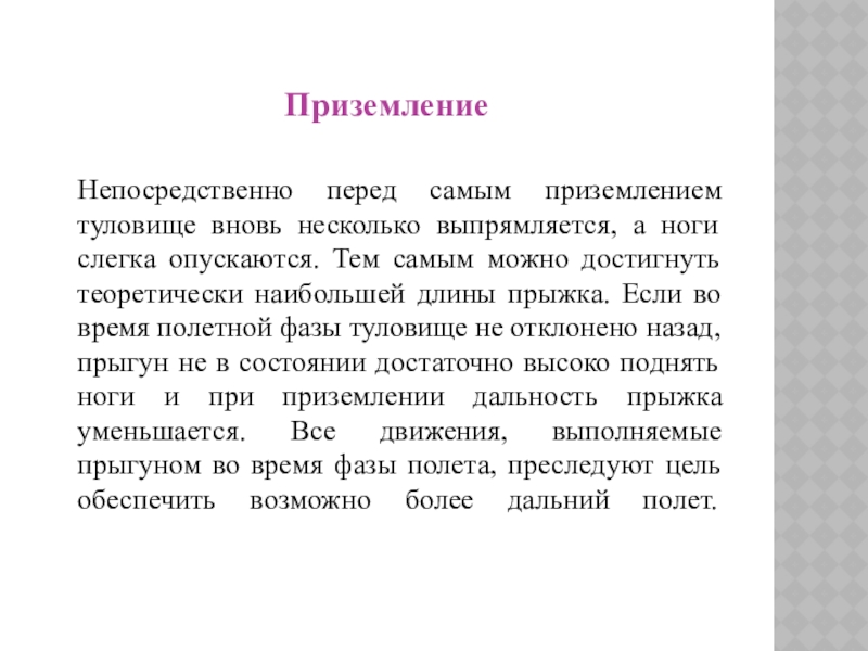 Непосредственно перед самым приземлением туловище вновь несколько выпрямляется, а ноги слегка