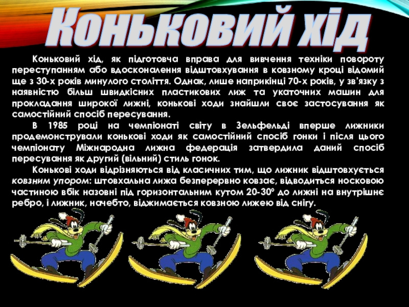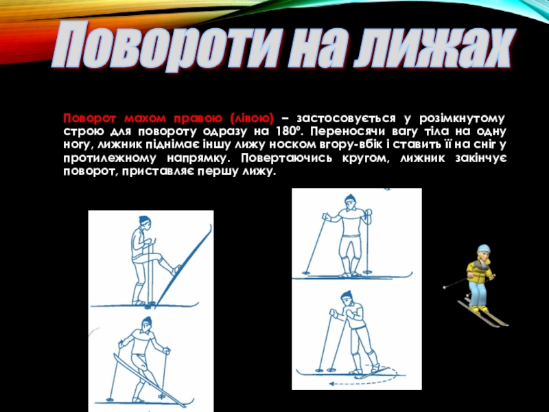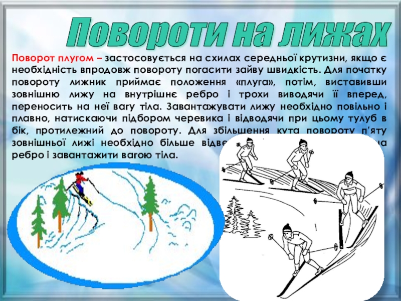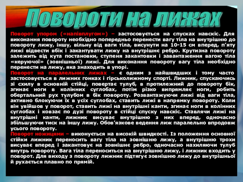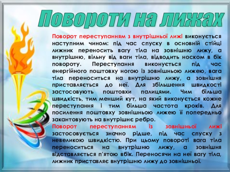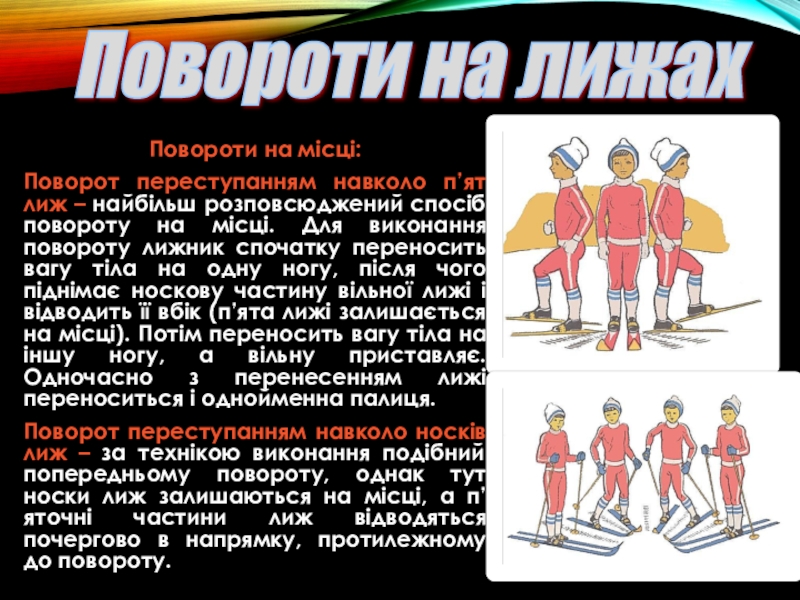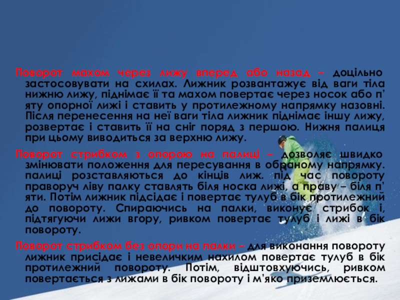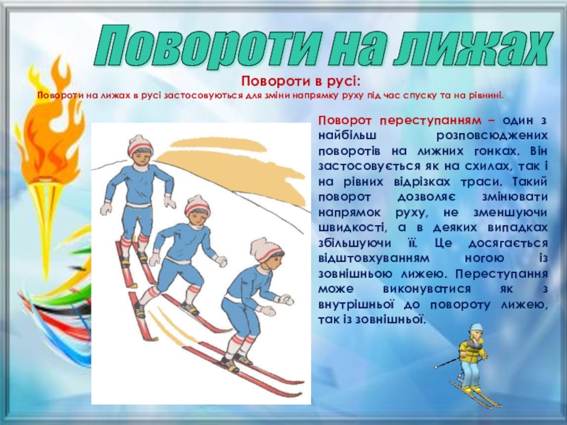 Поворот переступанням – один з найбільш розповсюджених поворотів на лижних гонках. Він застосовується як на схилах, так і на рівних відрізках траси. Такий поворот дозволяє змінювати напрямок руху, не зменшуючи швидкості, а в деяких випадках збільшуючи її. Це досягається відштовхуванням ногою із зовнішньою лижею. Переступання може виконуватися як з внутрішньої до повороту лижею, так із зовнішньої.