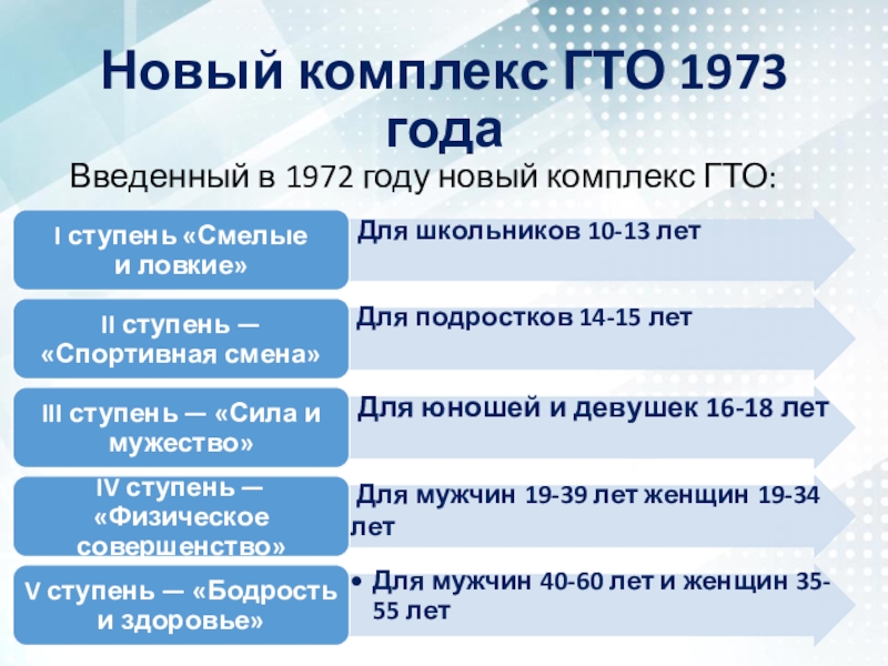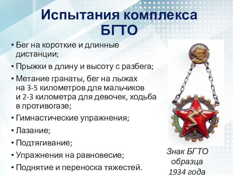 Первый комплекс ГТО состоял всего из одной ступени и предполагал выполнение 21 испытания, 15 из которых носили практический характер: