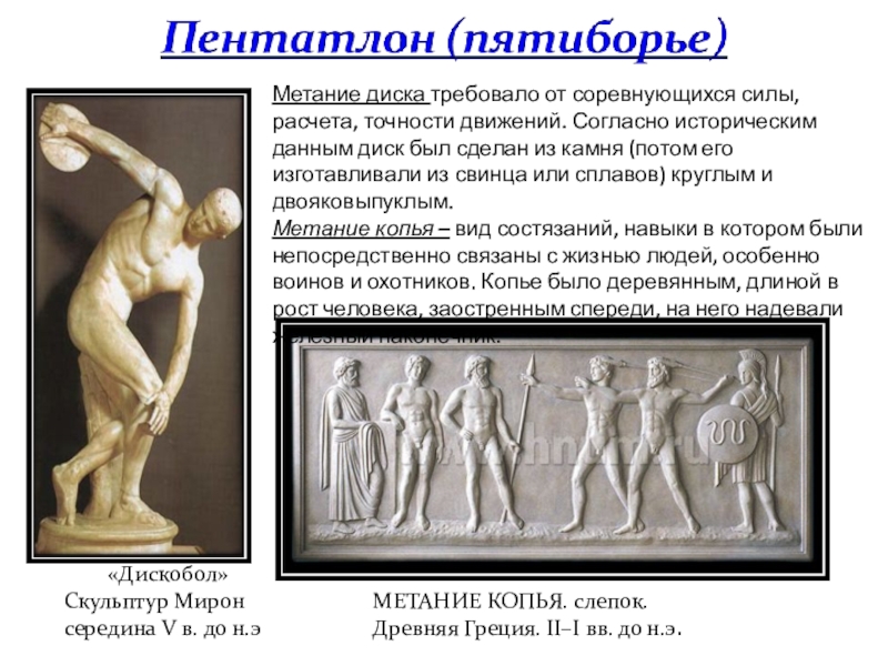 Метание диска требовало от соревнующихся силы, расчета, точности движений. Согласно историческим данным диск был сделан из камня (потом его изготавливали из свинца или сплавов) круглым и двояковыпуклым.