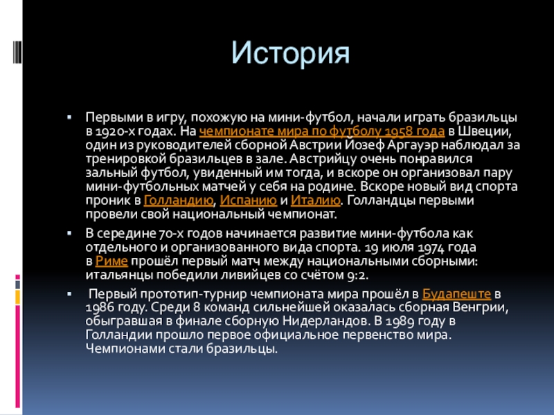 Первыми в игру, похожую на мини-футбол, начали играть бразильцы в 1920-х