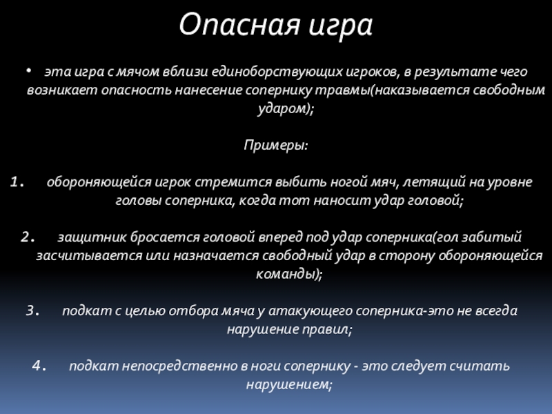 возникает опасность нанесение сопернику травмы(наказывается свободным ударом);