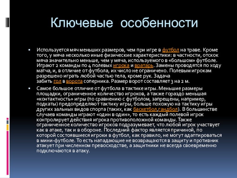 того, у мяча несколько иные физические характеристики: в частности, отскок мяча значительно меньше, чем у мяча, используемого в «большом» футболе. Играют 2 команды по 4 полевых игрока и вратарь. Замены проводятся по ходу матча, и, в отличие от футбола, их число не ограничено. Полевым игрокам разрешено играть любой частью тела, кроме рук. Задача забить гол в ворота соперника. Размер ворот составляет 3 на 2 м.