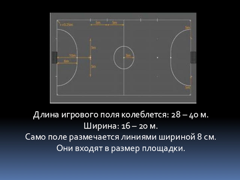 Слайд 5Длина игрового поля колеблется: 28 – 40 м.
