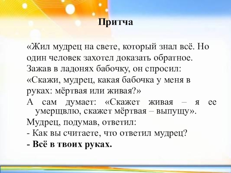 Притча«Жил мудрец на свете, который знал всё. Ноодин человек захотел доказать обратное.Зажав в ладонях бабочку, он спросил:«Скажи,