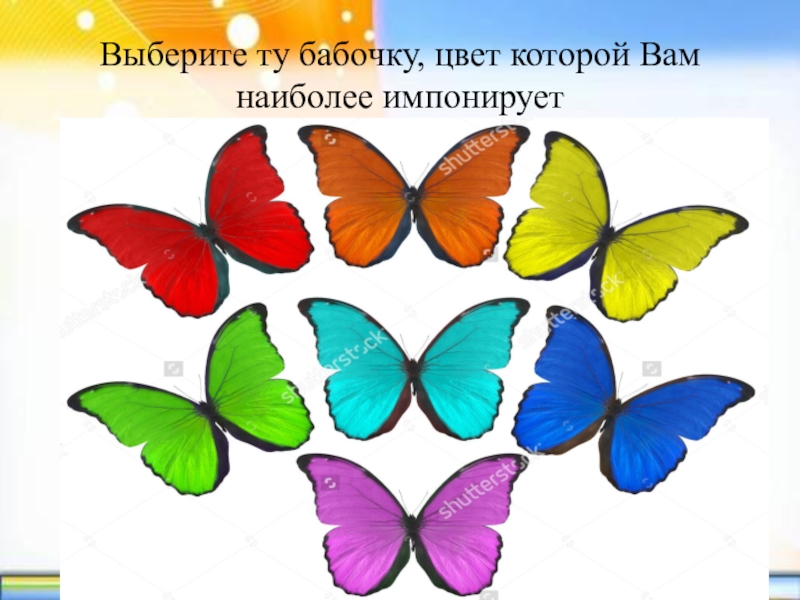 Слайд 1Выберите ту бабочку, цвет которой Вам наиболее импонирует