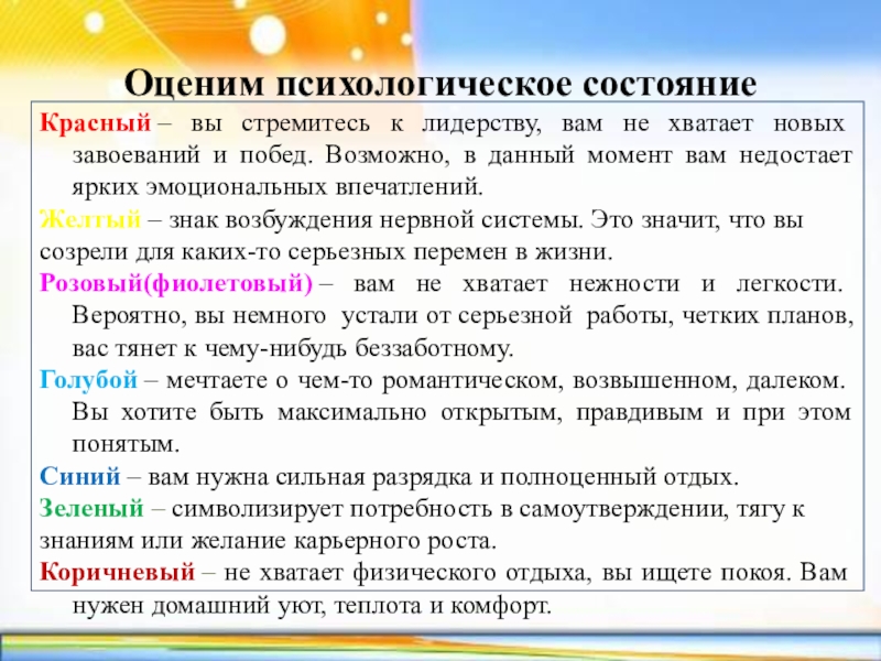 Оценим психологическое состояниеКрасный – вы стремитесь к лидерству, вам не хватает новых завоеваний и побед. Возможно, в данный момент вам недостает ярких эмоциональных впечатлений.Желтый – знак возбуждения нервной системы. Это значит, что высозрели для каких-то серьезных перемен в