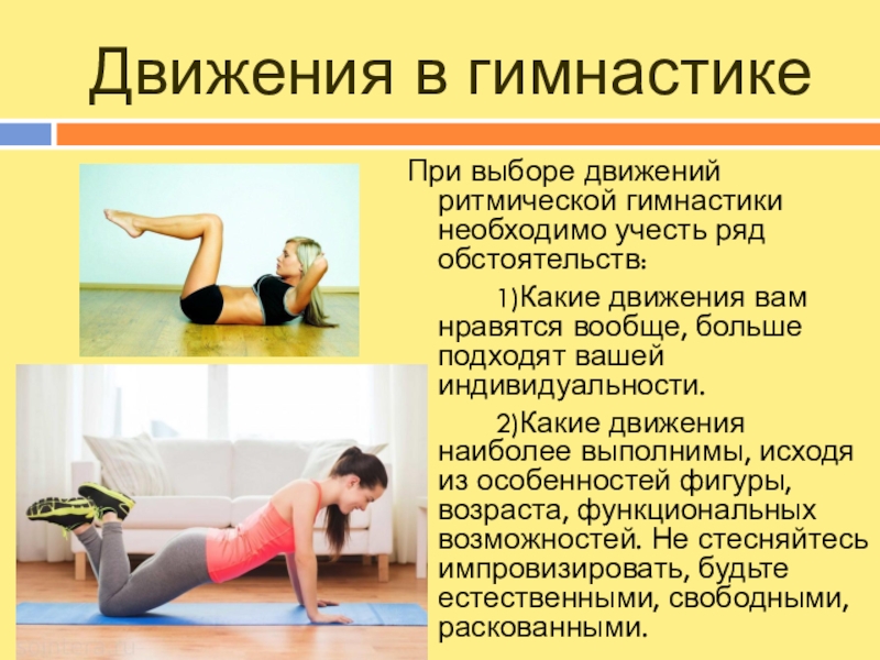 При выборе движений ритмической гимнастики необходимо учесть ряд обстоятельств: