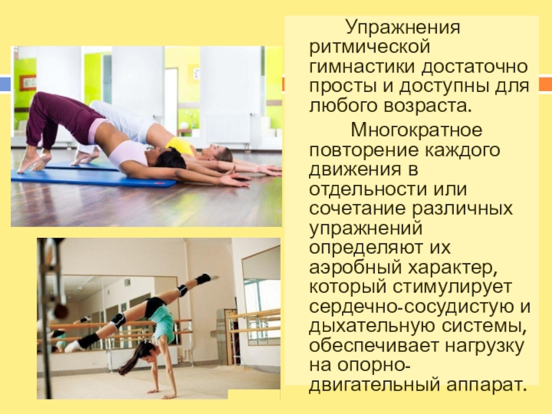 Слайд 11 Упражнения ритмической гимнастики достаточно просты и доступны для любого возраста.