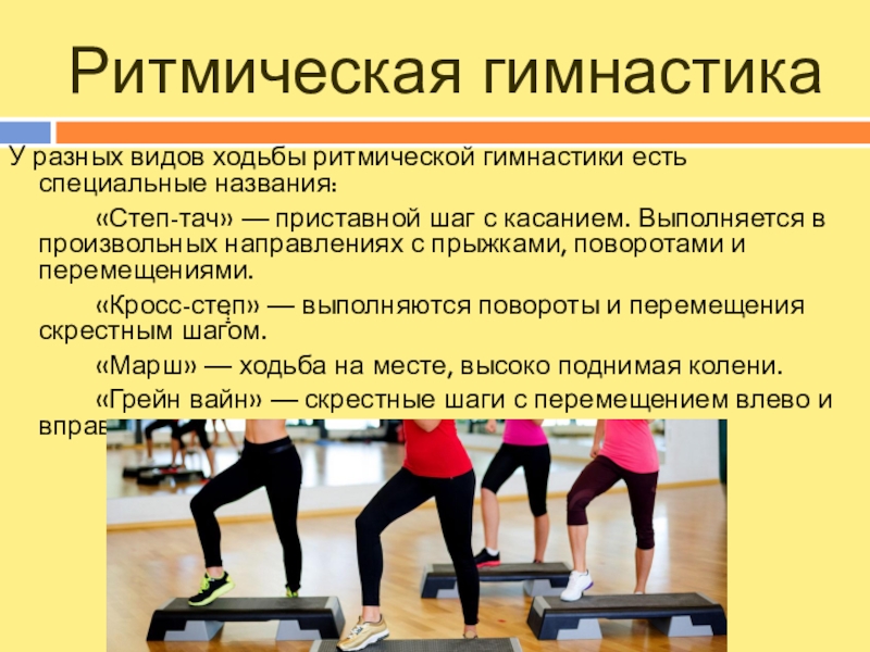 У разных видов ходьбы ритмической гимнастики есть специальные названия: