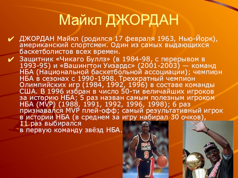 ДЖОРДАН Майкл (родился 17 февраля 1963, Нью-Йорк), американский спортсмен. Один