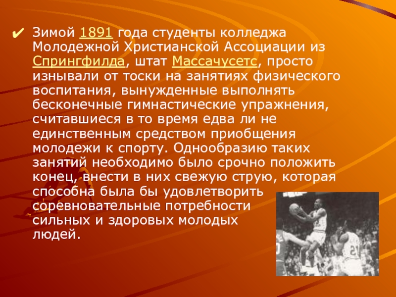 Слайд 7Зимой 1891 года студенты колледжа Молодежной Христианской Ассоциации из Спрингфилда, штат