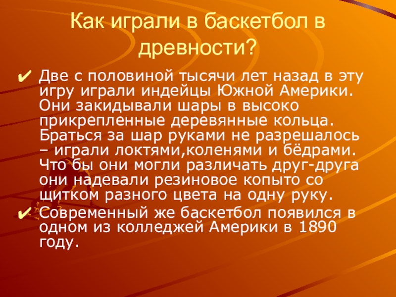 в эту игру играли индейцы Южной Америки.Они закидывали шары в высоко прикрепленные деревянные кольца.Браться за шар руками не разрешалось – играли локтями,коленями и бёдрами.Что бы они могли различать друг-друга они надевали резиновое копыто со щитком разного цвета на одну руку.