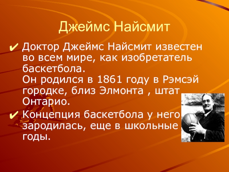Доктор Джеймс Найсмит известен во всем мире, как изобретатель баскетбола.