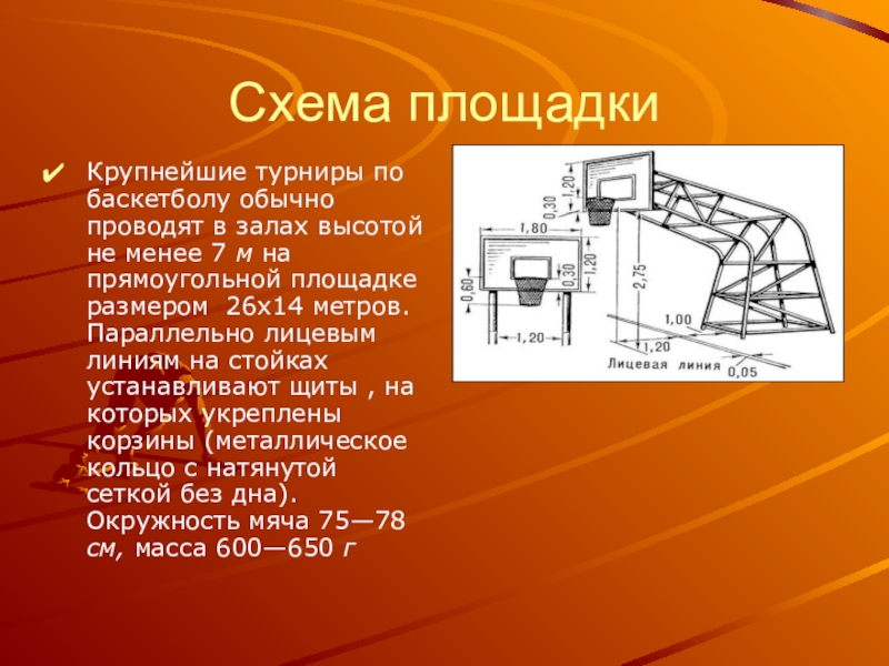 менее 7 м на прямоугольной площадке размером 26х14 метров. Параллельно лицевым линиям на стойках устанавливают щиты , на которых укреплены корзины (металлическое кольцо с натянутой сеткой без дна). Окружность мяча 75—78 см, масса 600—650 г