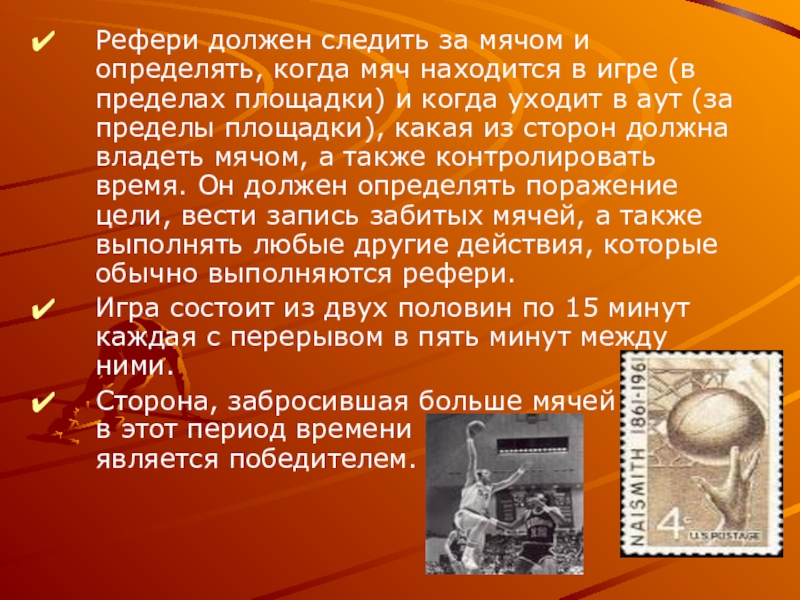 игре (в пределах площадки) и когда уходит в аут (за пределы площадки), какая из сторон должна владеть мячом, а также контролировать время. Он должен определять поражение цели, вести запись забитых мячей, а также выполнять любые другие действия, которые обычно выполняются рефери.