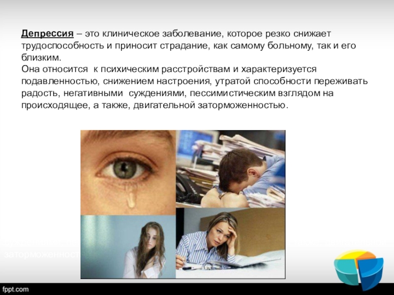 Она относится к психическим расстройствам и характеризуется подавленностью, снижением настроения, утратой способности переживать радость, негативными суждениями, пессимистическим взглядом на происходящее, а также, двигательной заторможенностью.