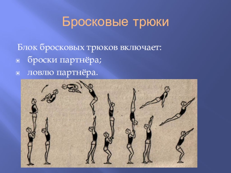 спорта или разных направлений танцев. То есть по сути это различные акробатические элементы (прыжки, перекаты, сальто, падения и другие), используемые в том или ином виде спорта или танцев.