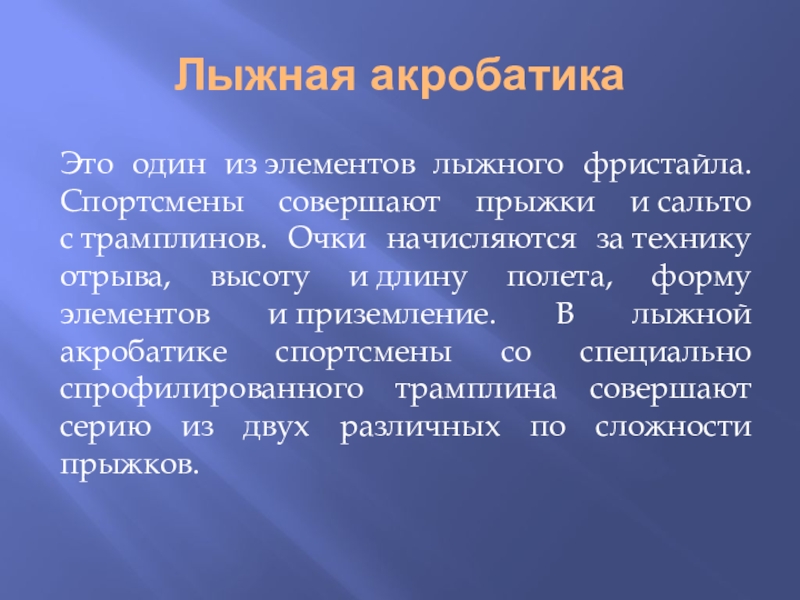 Очки начисляются за технику отрыва, высоту и длину полета, форму элементов и приземление. В лыжной акробатике спортсмены со специально спрофилированного трамплина совершают серию из двух различных по сложности прыжков.