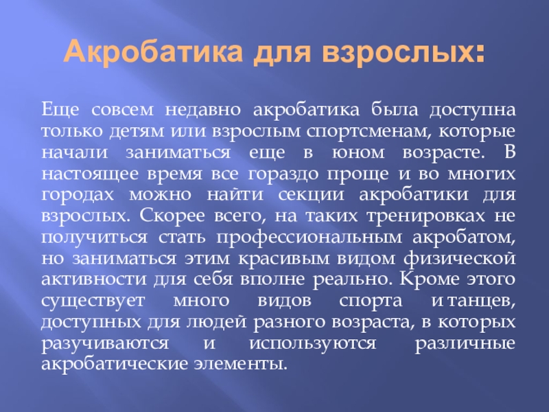 взрослым спортсменам, которые начали заниматься еще в юном возрасте. В настоящее время все гораздо проще и во многих городах можно найти секции акробатики для взрослых. Скорее всего, на таких тренировках не получиться стать профессиональным акробатом, но заниматься этим красивым видом физической активности для себя вполне реально. Кроме этого существует много видов спорта и танцев, доступных для людей разного возраста, в которых разучиваются и используются различные акробатические элементы.
