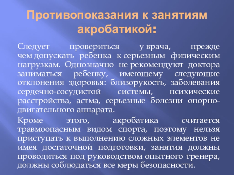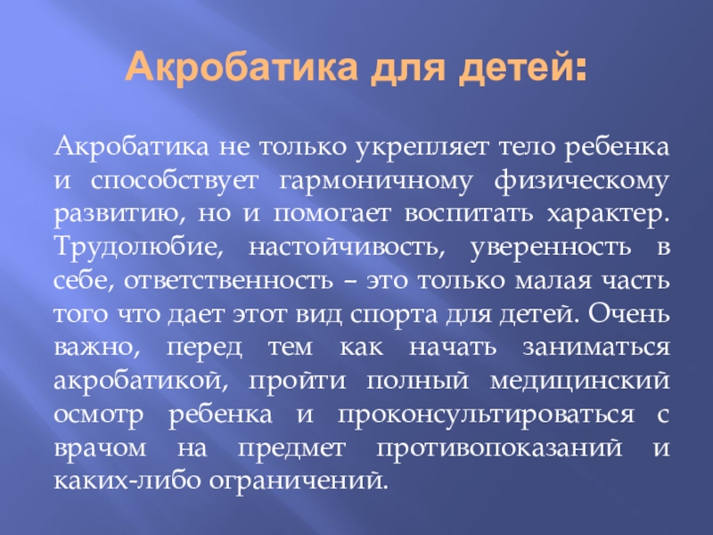 физическому развитию, но и помогает воспитать характер. Трудолюбие, настойчивость, уверенность в себе, ответственность – это только малая часть того что дает этот вид спорта для детей. Очень важно, перед тем как начать заниматься акробатикой, пройти полный медицинский осмотр ребенка и проконсультироваться с врачом на предмет противопоказаний и каких-либо ограничений.