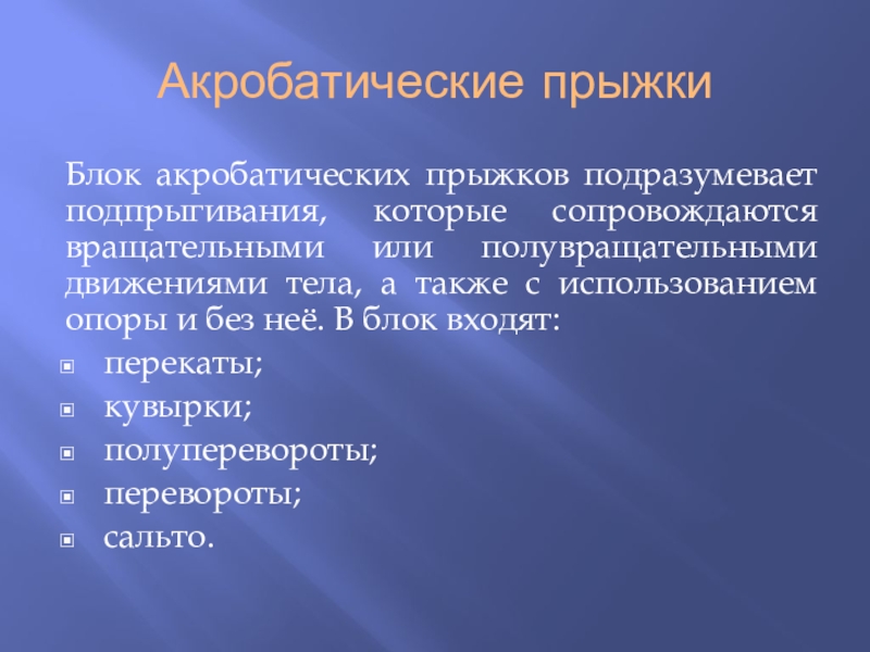 Блок акробатических прыжков подразумевает подпрыгивания, которые сопровождаются вращательными или полувращательными
