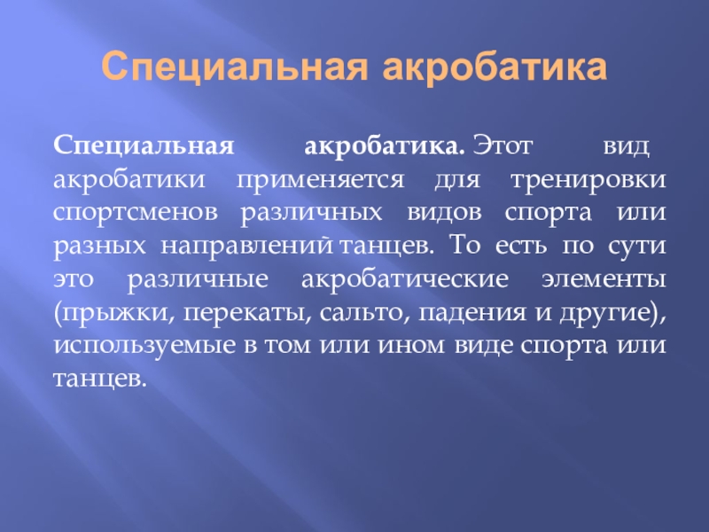 Специальная акробатика. Этот вид акробатики применяется для тренировки спортсменов различных видов