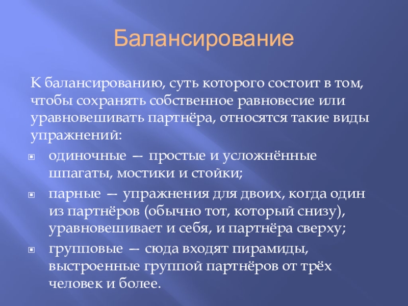 или уравновешивать партнёра, относятся такие виды упражнений: