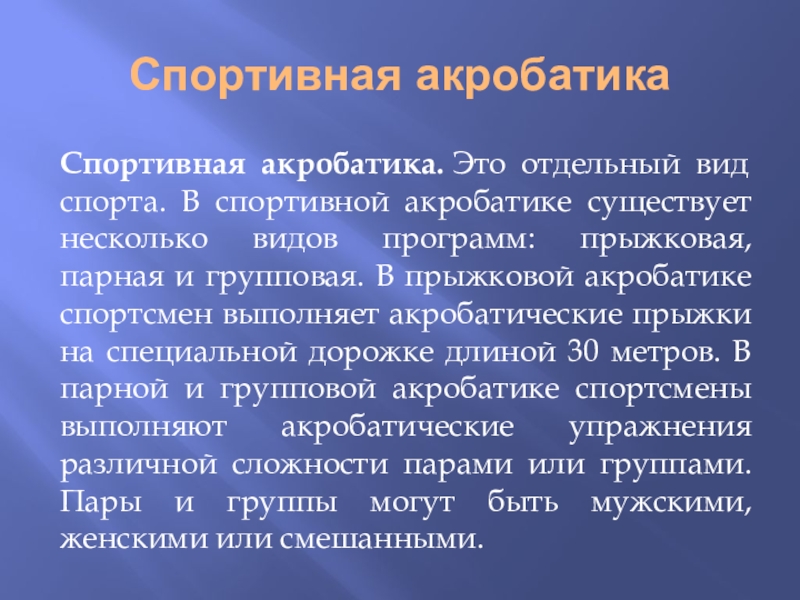 видов программ: прыжковая, парная и групповая. В прыжковой акробатике спортсмен выполняет акробатические прыжки на специальной дорожке длиной 30 метров. В парной и групповой акробатике спортсмены выполняют акробатические упражнения различной сложности парами или группами. Пары и группы могут быть мужскими, женскими или смешанными.