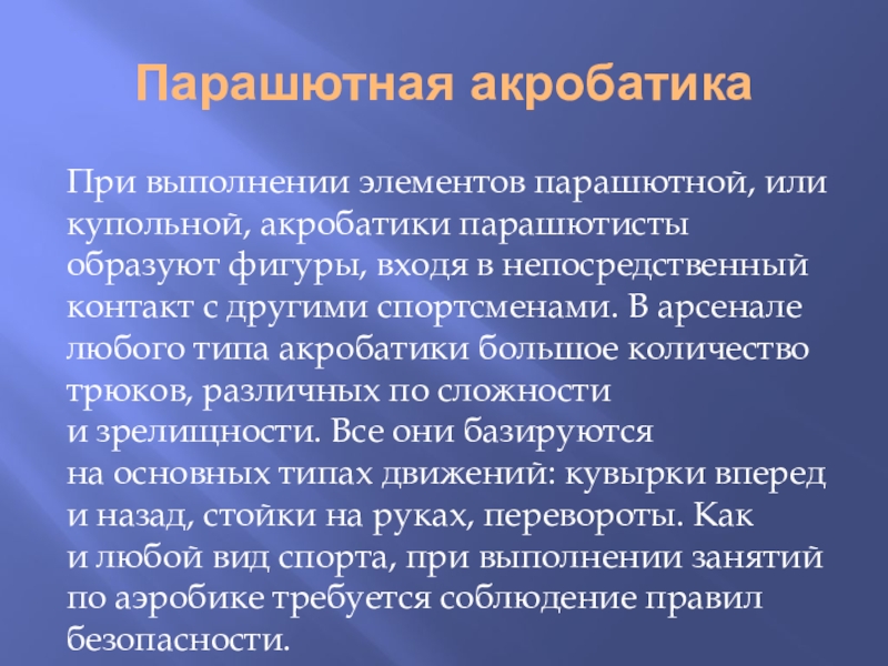 в непосредственный контакт с другими спортсменами. В арсенале любого типа акробатики большое количество трюков, различных по сложности и зрелищности. Все они базируются на основных типах движений: кувырки вперед и назад, стойки на руках, перевороты. Как и любой вид спорта, при выполнении занятий по аэробике требуется соблюдение правил безопасности.