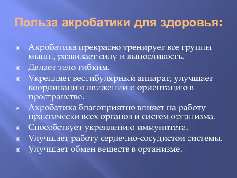 Акробатика благоприятно влияет на работу практически всех органов и систем организма.