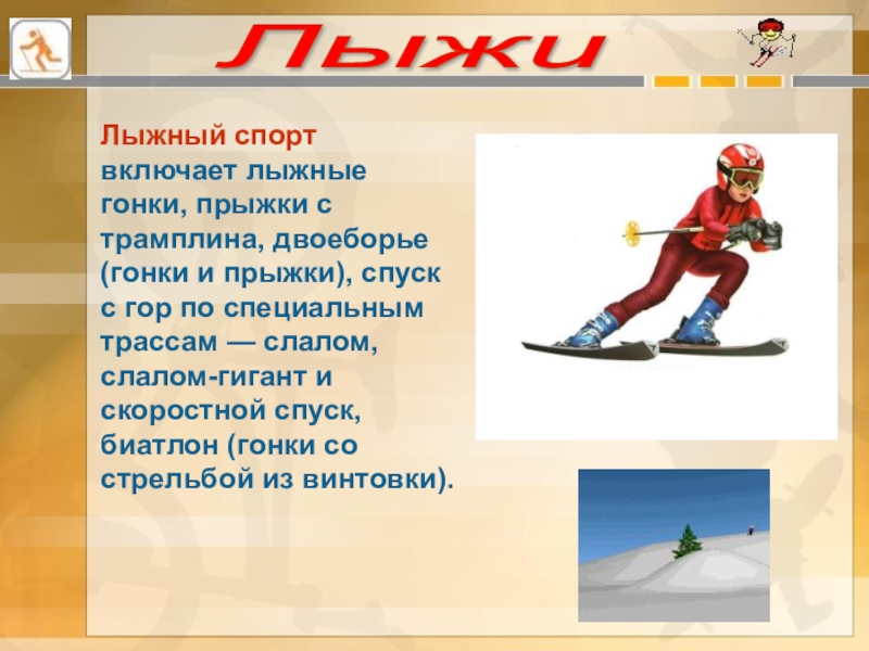 Лыжи Лыжный спорт включает лыжные гонки, прыжки с трамплина, двоеборье (гонки и прыжки), спуск с гор по