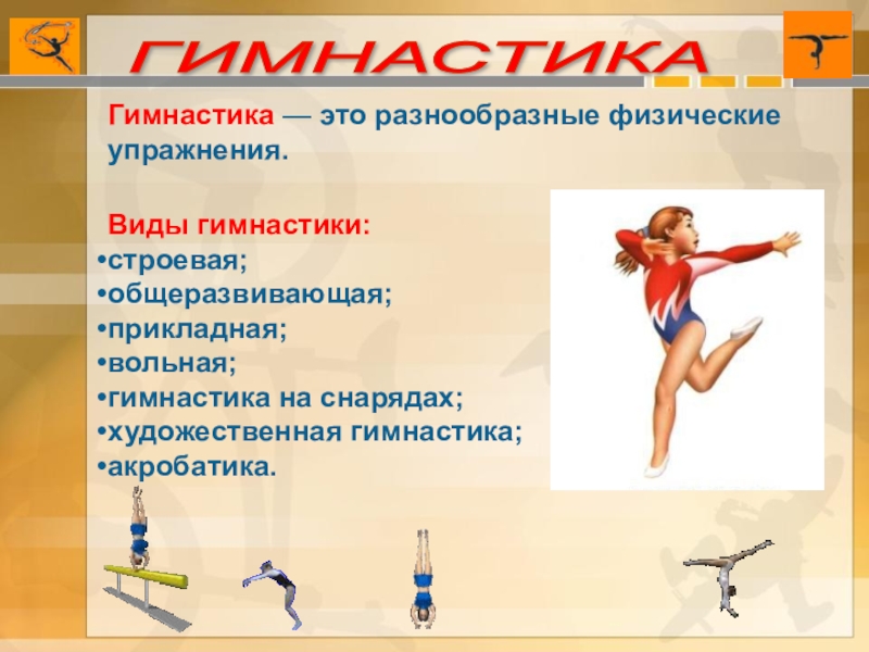 Гимнастика — это разнообразные физические упражнения. Виды гимнастики:строевая; общеразвивающая; прикладная; вольная; гимнастика на снарядах;художественная гимнастика; акробатика.ГИМНАСТИКА