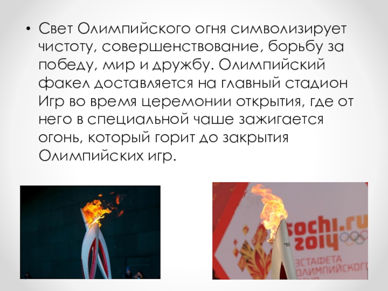 Слайд 8Свет Олимпийского огня символизирует чистоту, совершенствование, борьбу за победу, мир и