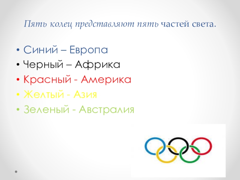 Слайд 13Пять колец представляют пять частей света.