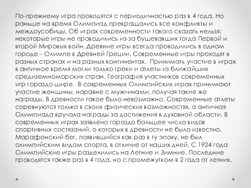на время Олимпиад прекращались все конфликты и междоусобицы. Об играх современности такого сказать нельзя: некоторые игры не проводились из-за бушевавших тогда Первой и второй Мировых войн. Древние игры всегда проводились в одном городе – Олимпе в Древней Греции. Современные игры проходят в разных странах и на разных континентах. Принимать участие в играх в античное время могли только греки и атлеты из ближайших средиземноморских стран. География участников современных игр гораздо шире. В современных Олимпийских играх принимают участие женщины, наравне с мужчинами, получая такие же награды. В древности такое было невозможно. Современные атлеты соревнуются только в своих физических возможностях, а античная Олимпиада вручала награды за достижения в духовной области. В современных играх заявлено гораздо большее число видов спортивных состязаний, о которых в древности не было известно. Марафонский бег, появившийся как раз в ту эпоху, не был олимпийским видом спорта, в отличие от наших дней. С 1924 года Олимпийские игры разделились на Летние и Зимние. Последние проводятся также раз в 4 года, но с промежутком в 2 года от летних.