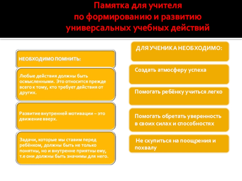 Памятка для учителя по формированию и развитию  универсальных учебных действий ДЛЯ УЧЕНИКА НЕОБХОДИМО:Создать атмосферу успехаПомогать ребёнку