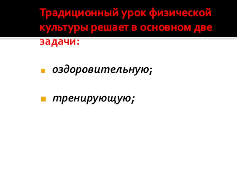 Традиционный урок физической культуры решает в основном две задачи: оздоровительную; тренирующую;