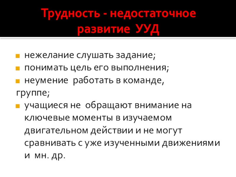 Трудность - недостаточное развитие  УУДнежелание слушать задание;понимать цель его выполнения;неумение  работать в команде, группе; учащиеся не  обращают