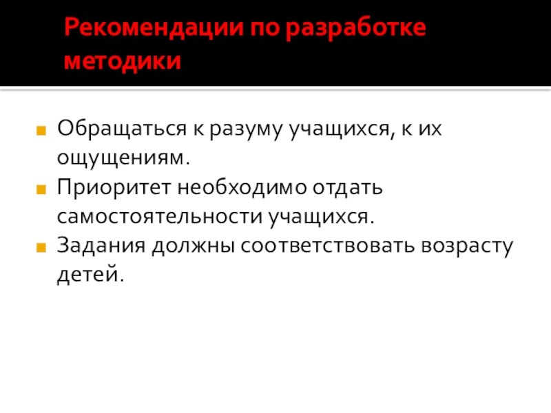 Рекомендации по разработке методикиОбращаться к разуму учащихся, к их ощущениям. Приоритет необходимо отдать самостоятельности учащихся.Задания должны соответствовать