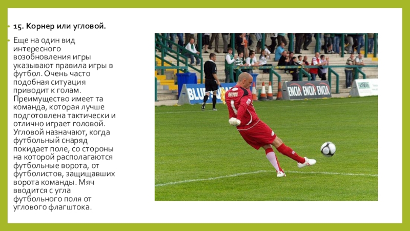 правила игры в футбол. Очень часто подобная ситуация приводит к голам. Преимущество имеет та команда, которая лучше подготовлена тактически и отлично играет головой. Угловой назначают, когда футбольный снаряд покидает поле, со стороны на которой располагаются футбольные ворота, от футболистов, защищавших ворота команды. Мяч вводится с угла футбольного поля от углового флагштока.