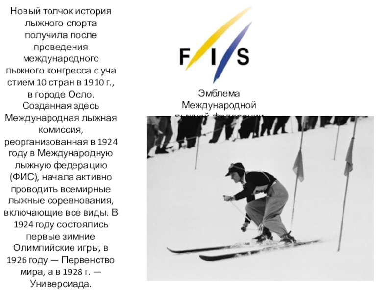 с участием 10 стран в 1910 г., в городе Осло. Созданная здесь Международная лыжная комиссия, реорганизованная в 1924 году в Международную лыжную федерацию (ФИС), начала активно проводить всемирные лыжные соревнования, включающие все виды. В 1924 году состоялись первые зимние Олимпийские игры, в 1926 году — Первенство мира, а в 1928 г. — Универсиада.